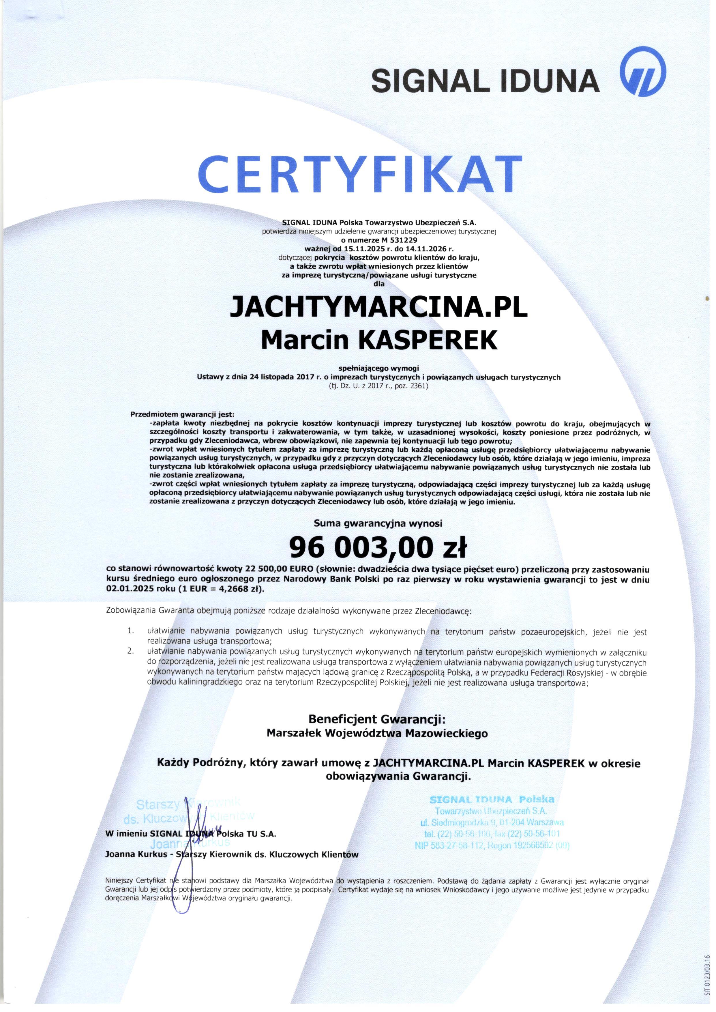 Bezpieczeństwo czarteru z jachtymarcina.pl gwarantuje od 2018 roku Signal Iduna Polska S.A. Firma jest zarejestrowana pod numerem 21162 (numer wpisu 2124) w Centralnej Ewidencji Organizatorów Turystyki i Przedsiębiorców Ułatwiających Nabywanie Powiązanych Usług Turystycznych. Każdy czarter jest zabezpieczony także Turystycznym Funduszem Gwarancyjnym.