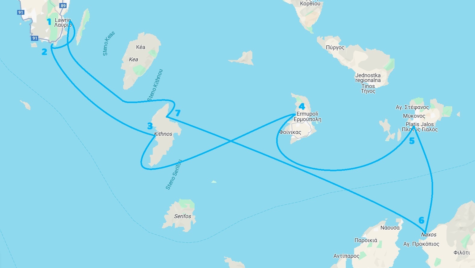 Największe atrakcje: Lavrio (1), Sounion (Świątynia Posejdona 2) , Kithnos (3, 7) , Siros (4), Mykonos (5), Naxos (6)