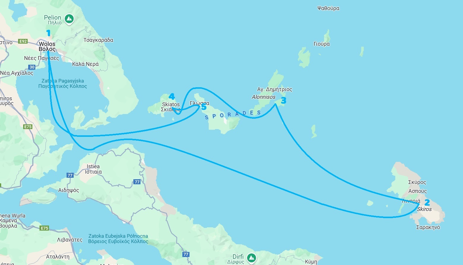 Największe atrakcje: Volos (1), Skiros (2), Peristera (3), Skiatos (4), Skopelos (5), Alonnisos
