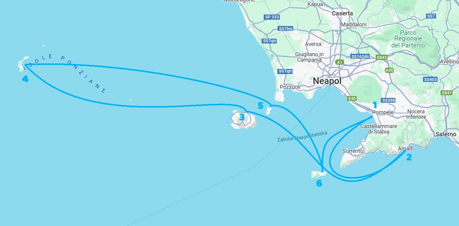 Neapol jest dobrze skomunikowany z polskimi lotniskami, a sam rejs można rozpocząć w Neapolu, pobliskim Marina di Stabia (można dojechać słynną kolejką Circumvesuviana), Salerno (na kontynencie) lub Marina di Procida (to już na wyspie – transport promem z Neapolu). Każdy z tych portów początkowych umożliwia odkrycie pełnego uroku i atrakcji zatoki oraz wysp.